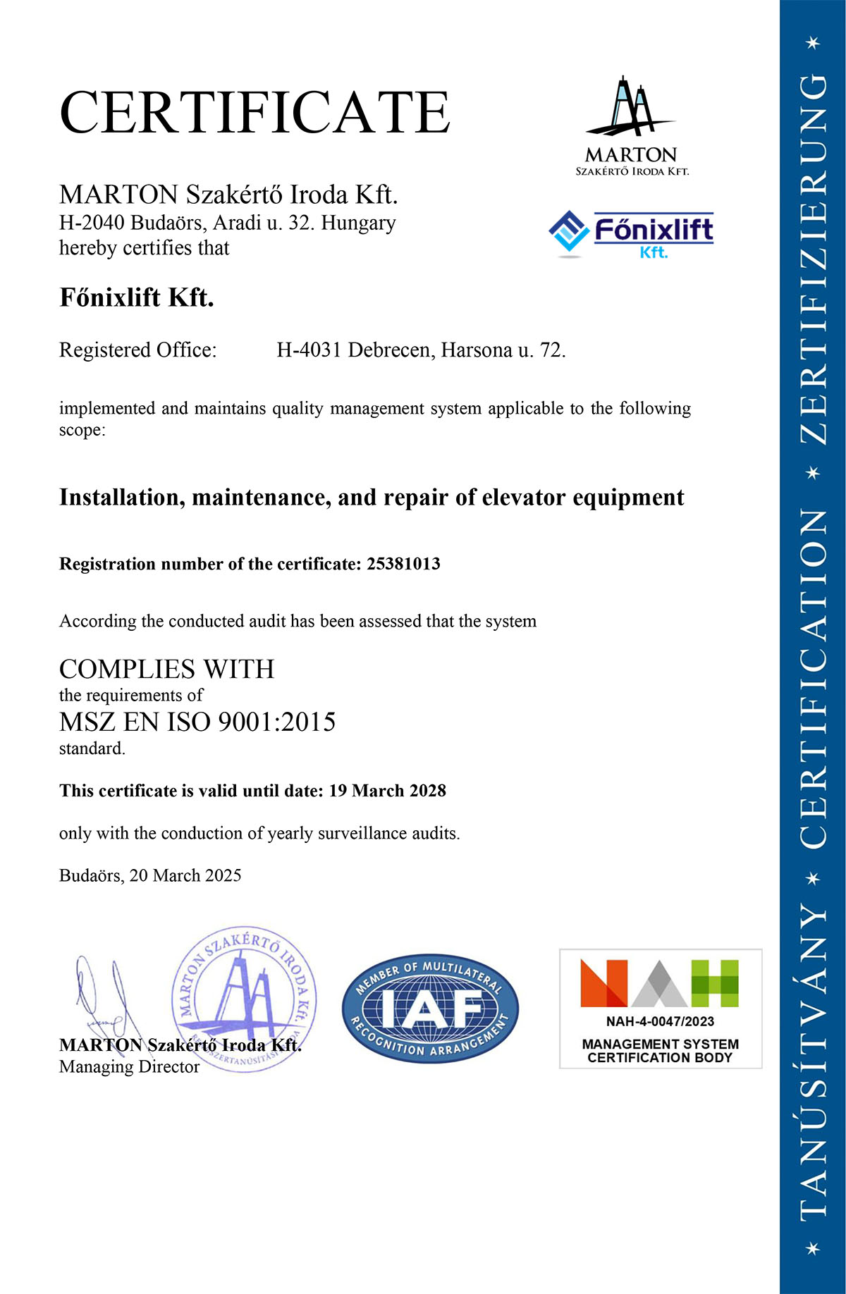 A Főnixlift Kft. a Lift-s egyesület és Magyar Felvonó Szövetség tagja